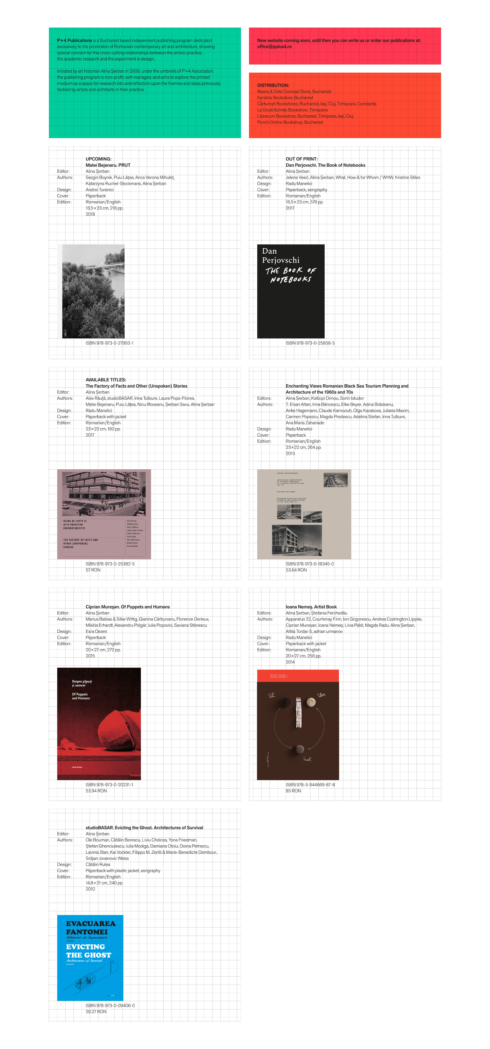 P+4 Publications is a Bucharest based independent publishing program dedicated exclusively to the promotion of Romanian contemporary art and architecture, showing special concern for the cross-cutting relationships between the artistic practice, the academic research and the experiment in design. Initiated by art historian Alina Şerban in 2009, under the umbrella of P+4 Association, the publishing program is non-profit, self-managed, and aims to explore the printed medium as a space for research into and reflection upon the themes and ideas previously tackled by artists and architects in their practice. New website coming soon, until then you can write us at: office@pplus4.ro DISTRIBUTION: Beans & Dots Concept Store, Bucharest Kyralina Bookstore, Bucharest Cărturești Bookstores, Bucharest, Iași, Cluj, Timișoara, Constanța 2Bufnițe Bookstore, Timișoara Librarium Bookstore, Bucharest, Timișoara, Iași, Cluj Punch Online Bookshop, Bucharest NEW RELEASE: The Factory of Facts and Other (Unspoken) Stories Editor: Alina Șerban Authors: Alex Răuţă, studioBASAR, Irina Tulbure, Laura Popa‑Florea, Matei Bejenaru, Puiu Lăţea, Nicu Ilfoveanu, Şerban Savu, Alina Şerban Cover: Paperback, serigraphy Jacket: Paper Romanian / English 23 x 22 cm, 192 pp. 2017 ISBN 978-973-0-25382-5 57 lei